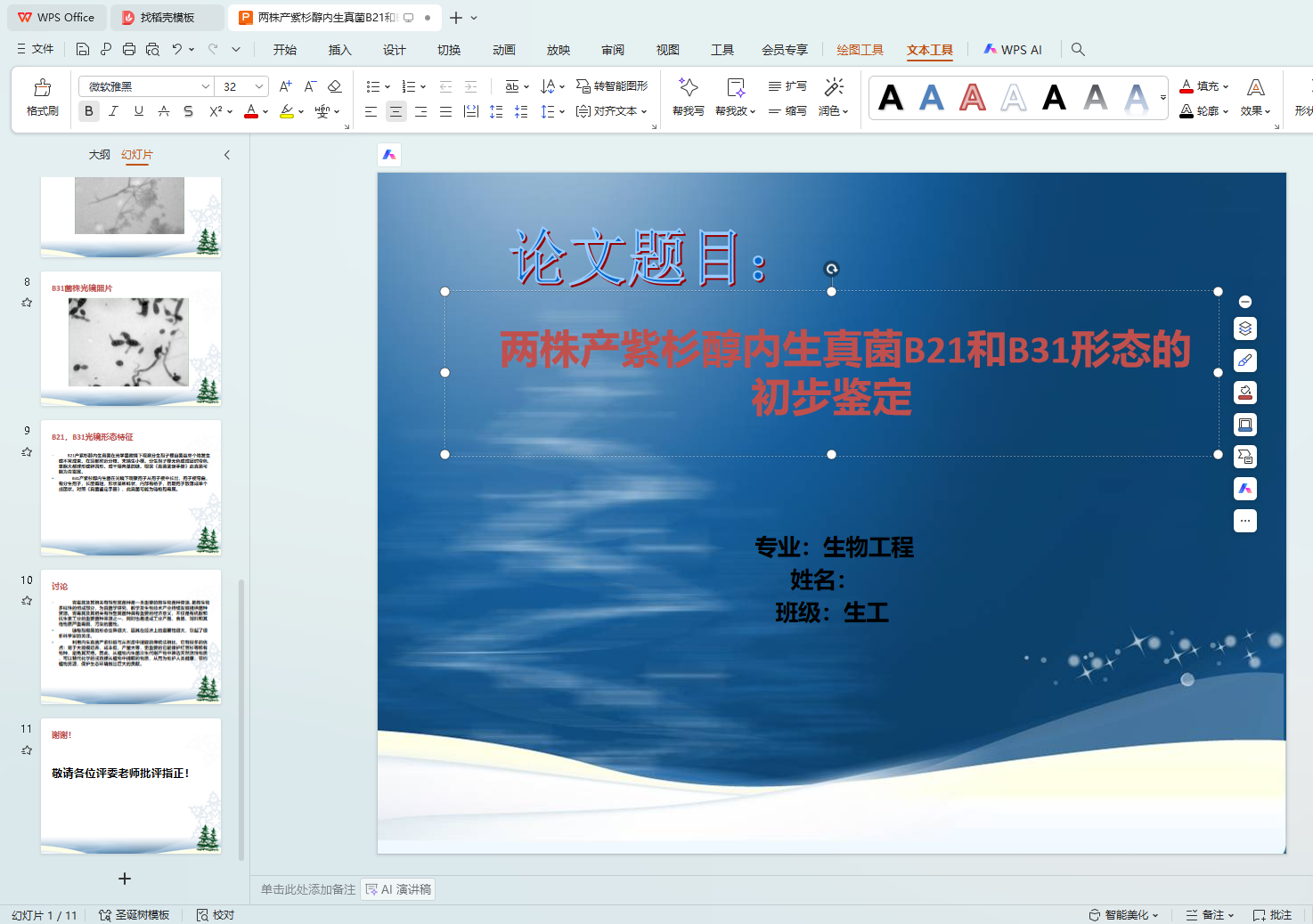 紫杉醇是一个非常重要的抗癌药物之一,它大部分都是从红杉等植物中提取出来的,而正是因为如此近年红豆杉等植物遭到人们大量的砍伐,濒临灭绝,因此为了保护红豆杉等资源,从其分离紫杉醇内生真菌并鉴定它的形态,为产紫杉醇内生真菌的选育奠定基础。本实验取了两株在实验室保藏很好的紫杉醇内生真菌株B21和B22,然后进行活化。在无菌操作条件下接种到PDA培养基上,再放入人工气候箱中培养,温度和湿度分别设为24℃和73%,观察形态和颜色的变化。当菌丝长满培养皿后进行制片,在光学显微镜下观察其孢子形态,对照《真菌鉴定手册》,初步鉴定B21可能为青霉属,B31可能为链格孢霉属。