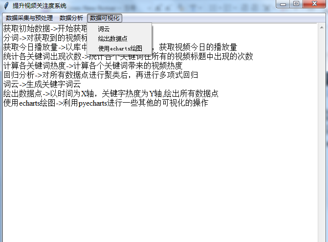 本系统采用文件存储方式,使用Python语言编程,基于大数据环境、k-means聚类算法及多项式回归,以vscode为开发工具开发的提升视频关注度系统。