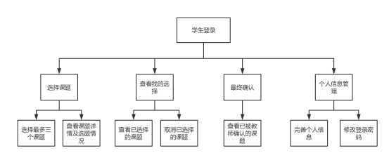 包括学生登录/登出、完善及修改个人信息、修改密码、选择至多三个课题、取消选择、查看课题详情及选题情况、查看我已选择的课题、查看最终确认的课题及课题详情、按教师名或课题名搜索题目等功能。如图2-6所示。