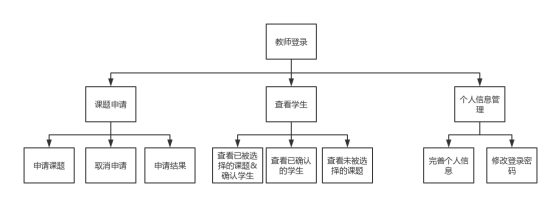 包括教师登录/登出、修改及完善个人信息、修改密码、提交课题、取消已提交的课题、修改课题信息、查看课题审批结果、查看已被学生选择的课题、选择课题对应的学生、查看已选择的学生、查看未被选择的课题等。如图2-7所示。