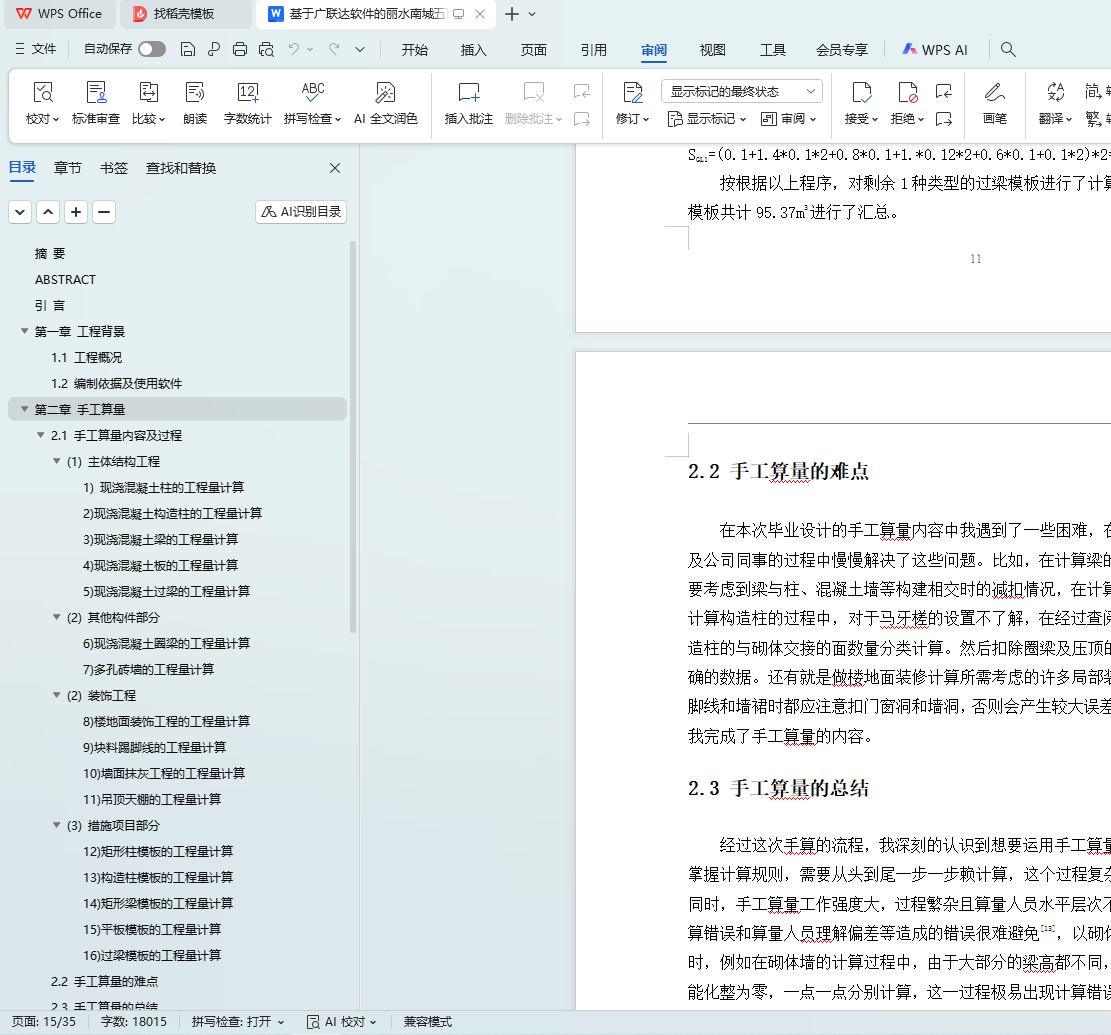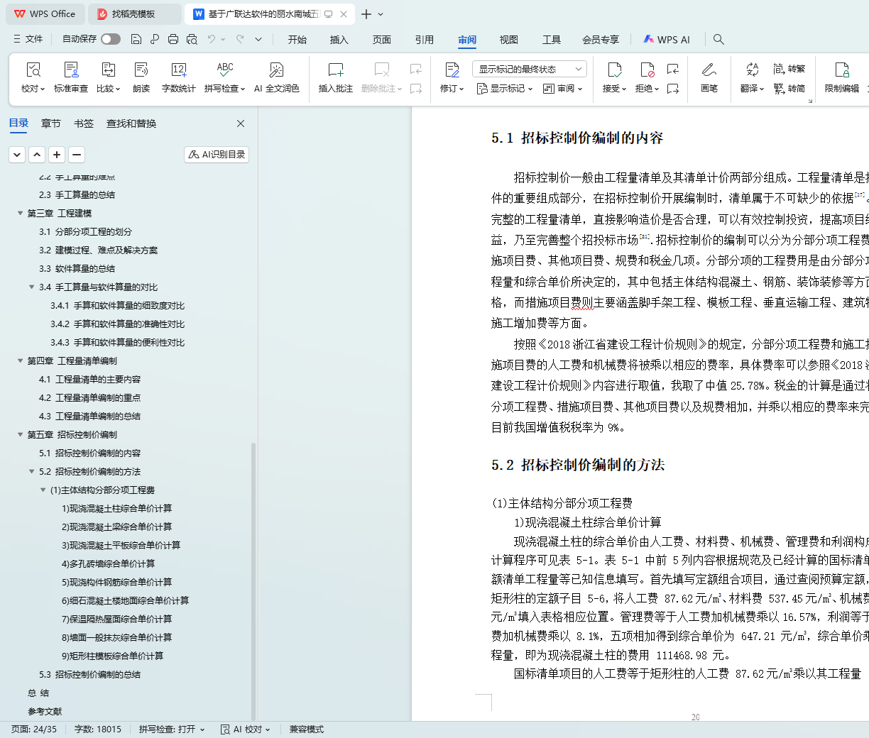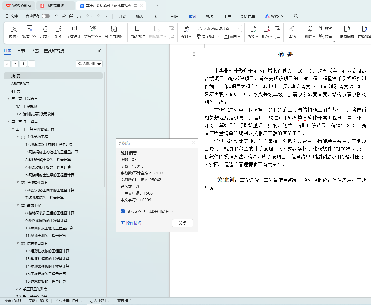 This graduation project focuses on the 5th Elderly Care Home project of Wulian Industrial Co., Ltd. in the Qibaiyang A - 10 - 9 plot of Lishui Nancheng, aiming to complete the preparation of the civil engineering quantity list and bidding control price for this project. The project is a frame - structured building with 6 floors above ground, a building height of 24.70m, a fire protection height of 23.80m, a building area of 7759.21 square meters, a fire resistance level of 2, a seismic fortification intensity of 6 degrees, and a structural seismic fortification category of B.