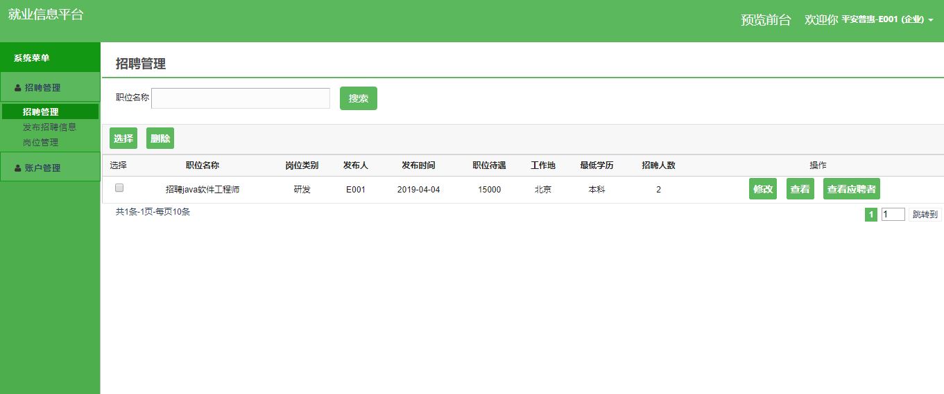 本文全面且深入地阐述了该就业平台在开发过程中的设计理念、开发环境选择以及所采用的关键技术。详细介绍了系统各功能模块的实现方法与具体设计流程,着重说明了数据库在管理系统中各类数据时所发挥的核心作用。此外,还对开发完成的平台进行了全面且系统的测试,以确保平台的稳定性与可靠性。