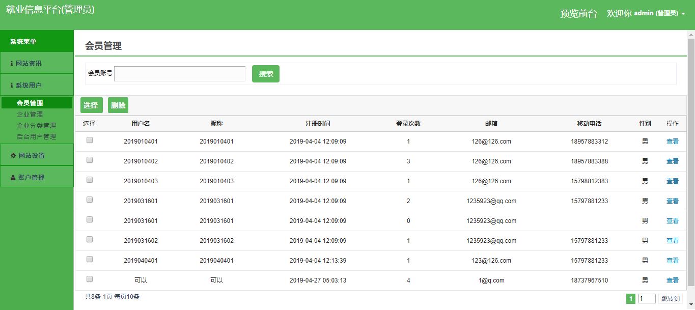 该高校大学生就业平台采用 JSP 技术,以 MYSQL 数据库作为数据存储支撑,基于 SSM 框架进行开发。在开发过程中,始终秉持界面简洁易用、功能实用完备的原则,成功搭建起就业平台的核心架构,实现了普通用户(高校大学生)、企业用户以及管理员三个不同角色所对应的功能模块。具体而言,为高校大学生提供了注册登录、个人信息修改、简历添加、查看招聘详情等功能;为企业用户赋予了发布招聘信息、管理招聘信息的权限;为管理员提供了包括下载文档管理、岗位管理、会员管理、企业管理以及企业分类管理等一系列全面且细致的管理功能,从而实现了对就业相关信息的全方位、高效管理。