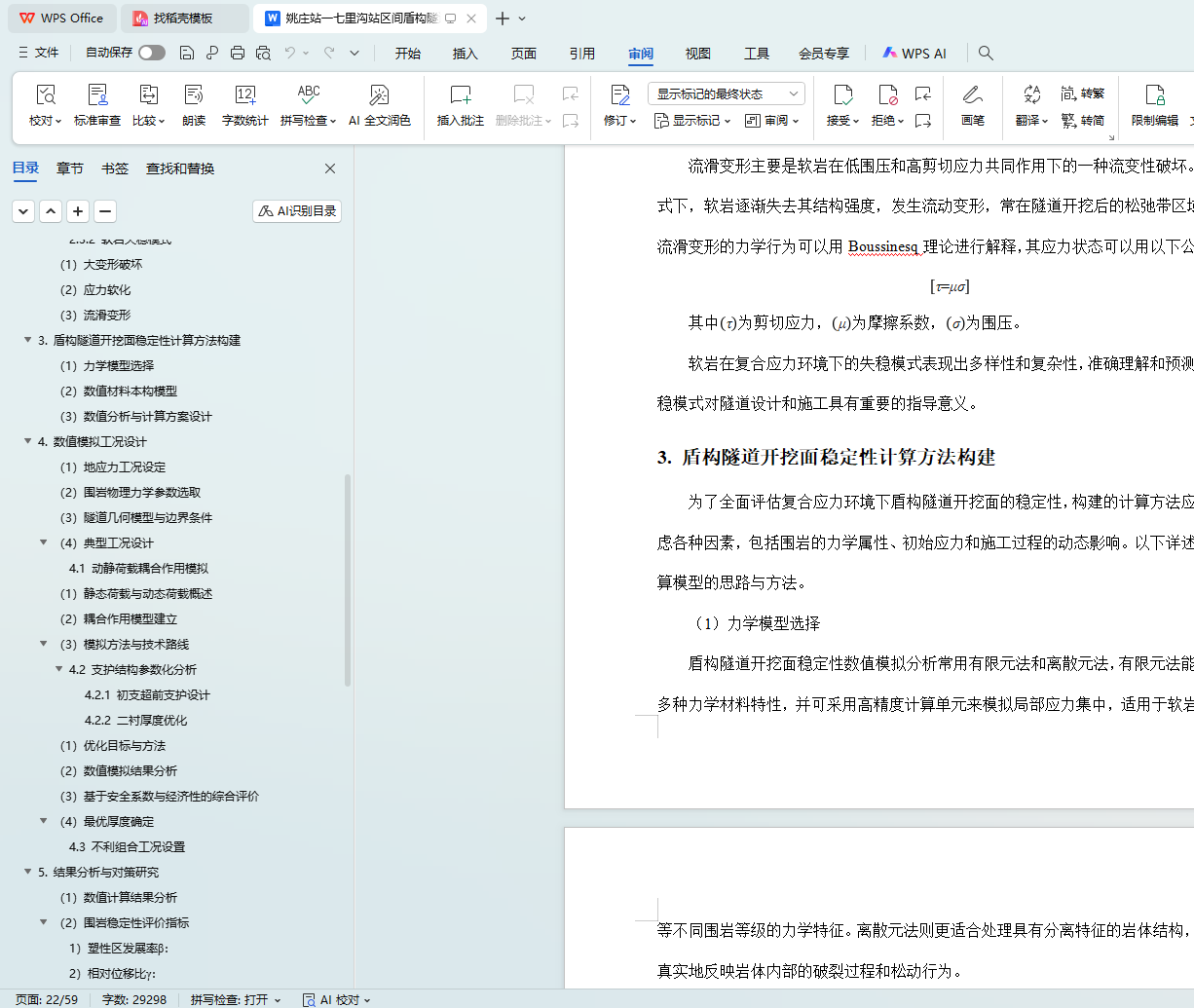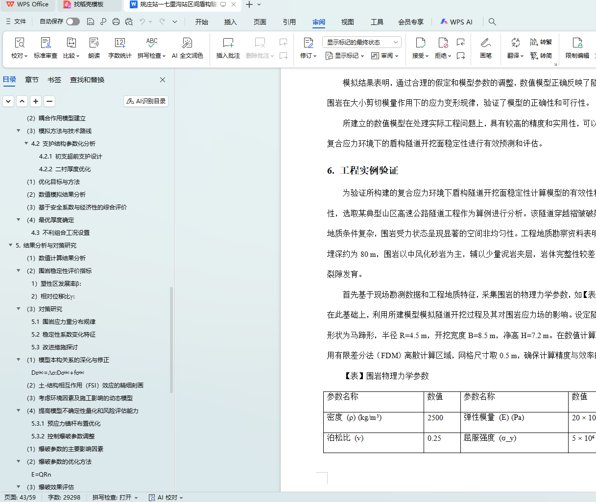 摘要:本文针对姚庄站 - 七里沟站区间盾构隧道 K2 + 300 - K2 + 800 段,开展开挖面稳定性数值模拟分析。首先阐述研究背景与意义,梳理国内外研究现状,指出现有模型局限性。接着分析复合应力场下盾构隧道开挖面力学特性,包括围岩应力分布规律、主次应力相互作用机理、不同地质条件下围岩特性等。构建盾构隧道开挖面稳定性计算方法,设计数值模拟工况,涵盖地应力工况、围岩参数、隧道几何模型与边界条件等。通过结果分析提出围岩稳定性评价指标,探讨改进措施,如模型本构关系修正、土 - 结构相互作用精细刻画等,并经工程实例验证。研究建立了复合应力环境下围岩稳定性计算模型,提出稳定性评价方法与工程应用建议,同时指出研究局限性,为未来研究指明方向。
