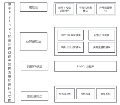 输出层:由邮件/短信提醒模块、可视化报表模块、异常预警模块组成,负责系统的通知、数据展示与预警输出。