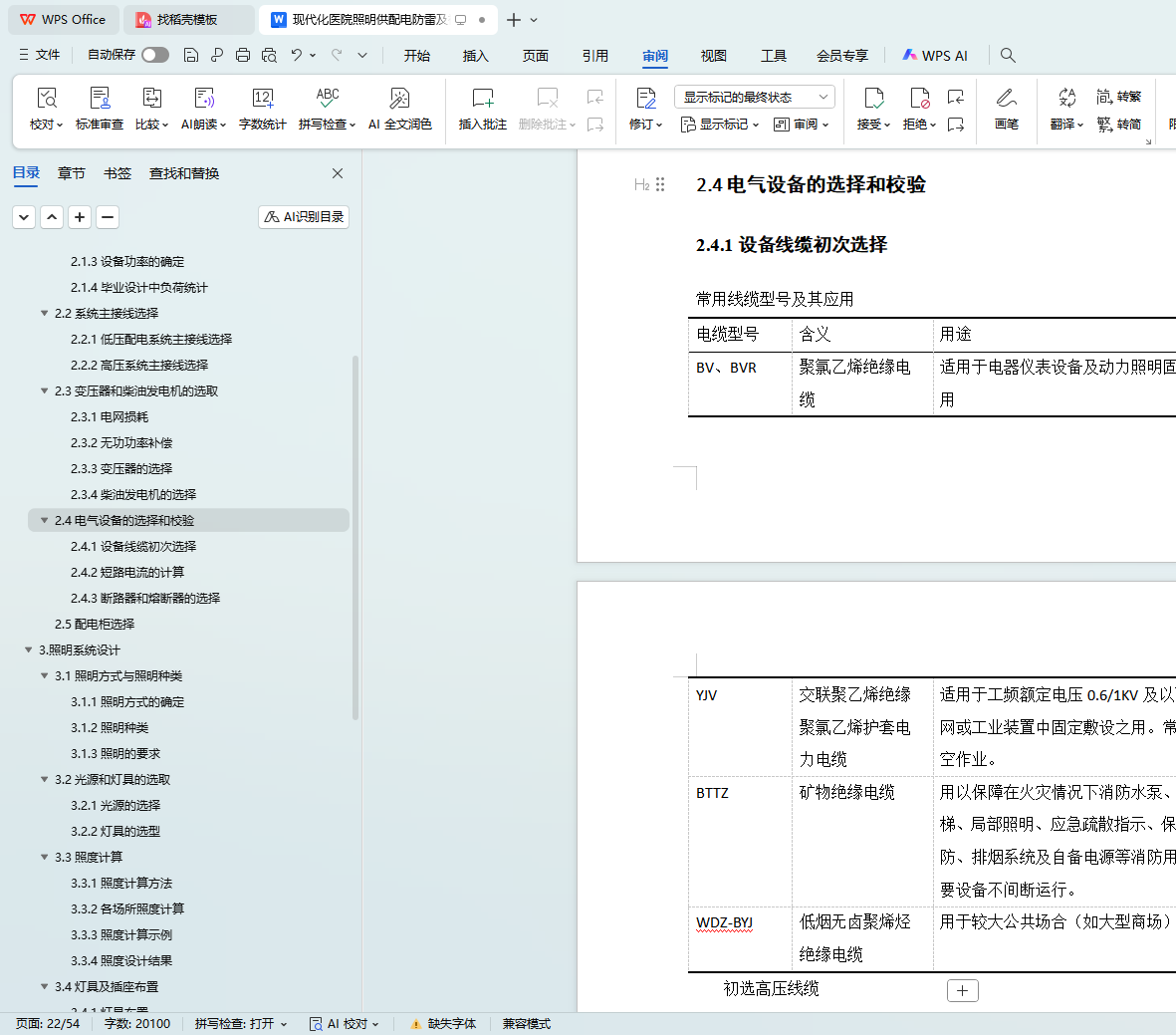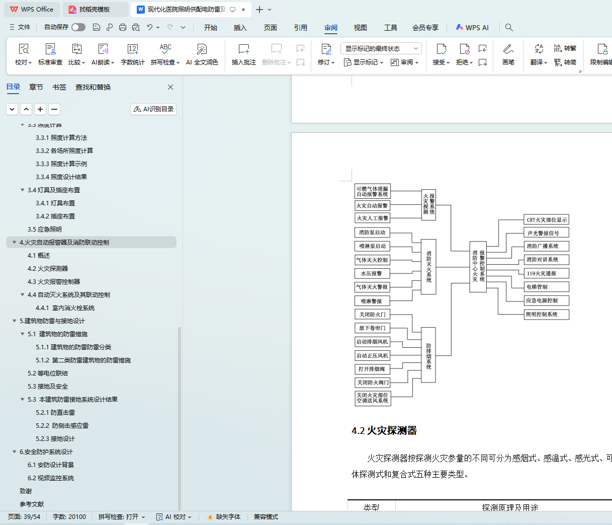 本论文将会在第二章的供配电设计中,根据规范要求,确定各方面的负荷等级,及配电需求。从设备选择,电压损失,电缆选型和电气设备选型和校验等方面介绍本次医疗大楼的配电设计。第三章的照明系统将会从照度计算,灯具选型及插座布置等几个方面进行讲解。第四章的火灾自动报警及消防联动控制系统将从防火等级的划分,探测器的选型和布置,消防联动控制等几个方面加以说明。第五章的防雷与接地设计将从防雷建筑的划分,接地要求和材料选型等方面加以说明。第六章的安防系统简要介绍视频监控。除此还会标出施工注意事项,让所做出的系统符合各个方面的要求。对于安装,以及布线的论述将会综合照明与配电统一介绍。
