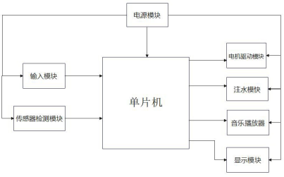 ③操作与交互界面需简洁易懂,且在机器表面处于醒目位置。本次给果蔬清洗机设计的交互界面为薄膜按钮与液晶屏幕,在舱盖前端与主体交界处设有倾斜的平面,颜色为黑色与白色主体以示区分, 薄膜按键附在该平面上,液晶显示屏安装在薄膜下方,兼具了防水性的同时,使交互更加简单。 2.2.4 控制系统的设计由于本次设计是适合家用,占地体积小,且要控制成本,所以将采用单片机控制。其清洗流程为: ①放入果蔬合上仓盖后,点击开始按键; ②机器开始自动清洗,上方喷射口开始喷射水流冲刷蔬菜表面; ③等待内仓里的水量达到合适的值后,电机启动带动蔬果篮开始旋转; ④清洗快结束时,缓慢排水电机低速旋转甩干水分。 如果水量达到最小值及其以上后设定清洗时间开始清洗还可以提前注入清洗液,设置延时启动, 选择浸泡时间,当果蔬浸泡消毒完后开始清洗,如果水量达到最小值及其以上后直接开始清洗,若无则继续注水直到达到最低水位。 为了达到以上流程需有模式选择键,水位传感器检测模块,液晶显示参数,通过单片机在控制电 机的启动,注水的模块启动,清洗结束完后,设有提醒音乐或语音提醒清洗结束。控制原理框图如图 2.6 所示。