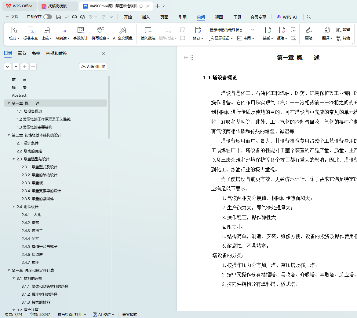 说明书反映了设计的基本过程。第一章为概述,主要阐述了设计的背景和塔的基本知识;第二章是基本结构的设计,从整体和部分各环节进行了机械的设计和选型;第三章则对已设计的方案进行各种载荷的计算以及校核,校核合格才能证明设计方案的合理性;第四章对需要补强的开孔进行了补强设计;最后一章说明了主要零部件的制造工艺。