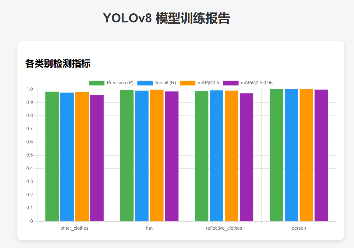 在实验部分,本论文验证了所提出系统在准确率、实时性和鲁棒性方面的优势。实验结果表明,本系统不仅能够在多种施工环境中稳定运行,还能在复杂条件下准确识别多种危险源。