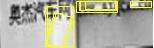 图b中黄色矩形框为图a中区域经字符判断后为字符的对象,被称为“字符种子”,浅绿色矩形框为为非字符对象,粉红色矩形框为在“字符种子”之间被搜素为字符的对象,蓝色矩形框为在最左和最右侧“字符种子”两侧进行“滑窗搜索”但检测结果不是字符的对象,红色是判断为字符的对象;
