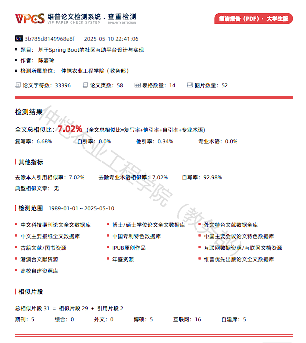 In traditional communities, mutual aid activities often face issues such as information asymmetry, communication difficulties, and slow message delivery. To address these challenges, a community mutual aid platform based on Spring Boot has been developed, utilizing digital tools to facilitate cooperation and mutual assistance among community members. This paper develops and implements a community support platform using Spring Boot, with the goal of providing community residents with a convenient channel for information sharing and Service requests. The system’s business processes are analyzed in detail using the UML (Unified Modeling Language) for feasibility analysis, requirements analysis, high-level design, and detailed design. The platform utilizes Spring Boot as the backend framework, combined with Vue for frontend development, employing a decoupled front-end and back-end architecture to enhance system flexibility and maintainability. MySQL is used for database storage, ensuring data security and system efficiency. The platform features core functions such as user registration and management, Service publishing and requesting, and community information sharing, while real-time updates and notification mechanisms enhance interaction. The system optimizes the user experience, supports efficient use on single devices, and ensures smooth operation, ultimately aiming to improve mutual aid efficiency and the overall quality of life for community residents.
