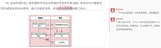 目录的格式存在问题,没有占满整个版心;业务流程图的题注存在问题;业务流程图存在问题,一个业务有多个入口;功能模块图需按功能相似度进行分类;时序图存在功能重复;图中题注引用顺序不对