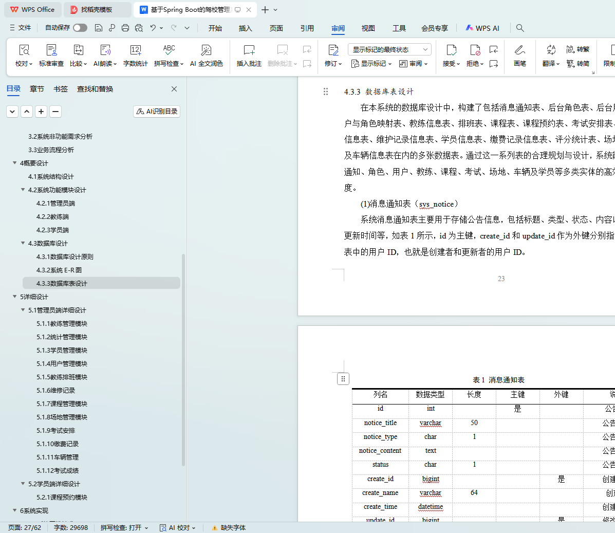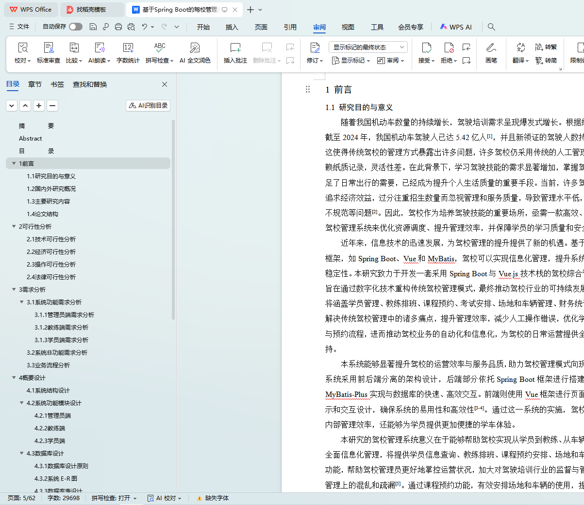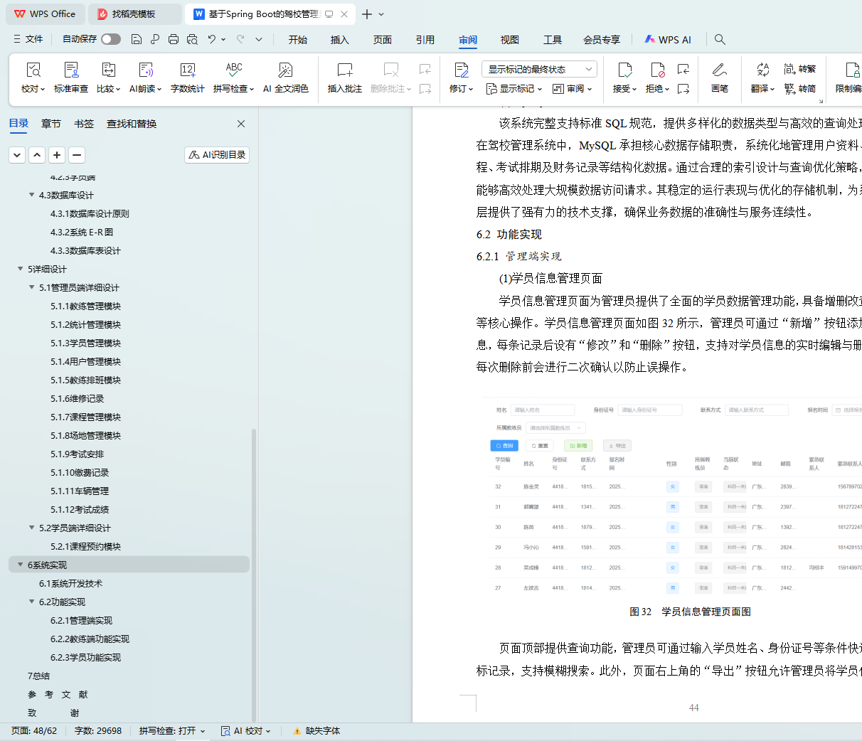 随着经济的快速发展和驾照需求的增加,传统驾校管理系统面临着信息化水平低、人工操作失误及效率低下等问题,本研究提出并开发了一套基于Spring Boot后端框架与Vue.js前端框架的驾校综合管理系统。可提高管理效率,优化资源配置,并加强对驾校各项事务的管理。本项目致力于开发一个驾校管理系统,该系统采用前后端分离的架构设计,主要涵盖学员管理、教练管理、教练排班、课程预约、考试成绩、考试安排和财报统计等功能模块,并通过角色权限控制实现安全管理。重点解决了教练排班中场地与车辆的排程冲突问题。本论文全面阐述系统的需求分析过程、架构设计思路以及关键功能模块。系统设计时充分考虑了扩展性与安全性,旨在为后续的功能拓展奠定一个稳固的基础。总体而言,所提出的系统有效推动了驾校行业的信息化建设,提升了管理效率与用户满意度。
