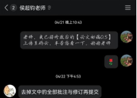 提交论文初稿0.5版本,侯老师指出,在正式提交论文前,需将文中所有的批注内容删除,以确保论文的整洁性和规范性。同时,要对论文完成最终的修订和完善工作,确保论文质量达到学术标准后再进行正式提交,以确保论文的整体质量。