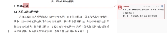 侯老师指出概要设计不画用例图,在概要设计阶段,应该更关注系统的模块划分、架构设计以及各模块之间的接口设计等方面。并指出参考文献可以如何作修改,对于引用的文献内容,要结合论文实际进行分析和阐述,而不能只是简单地罗列文献信息。
