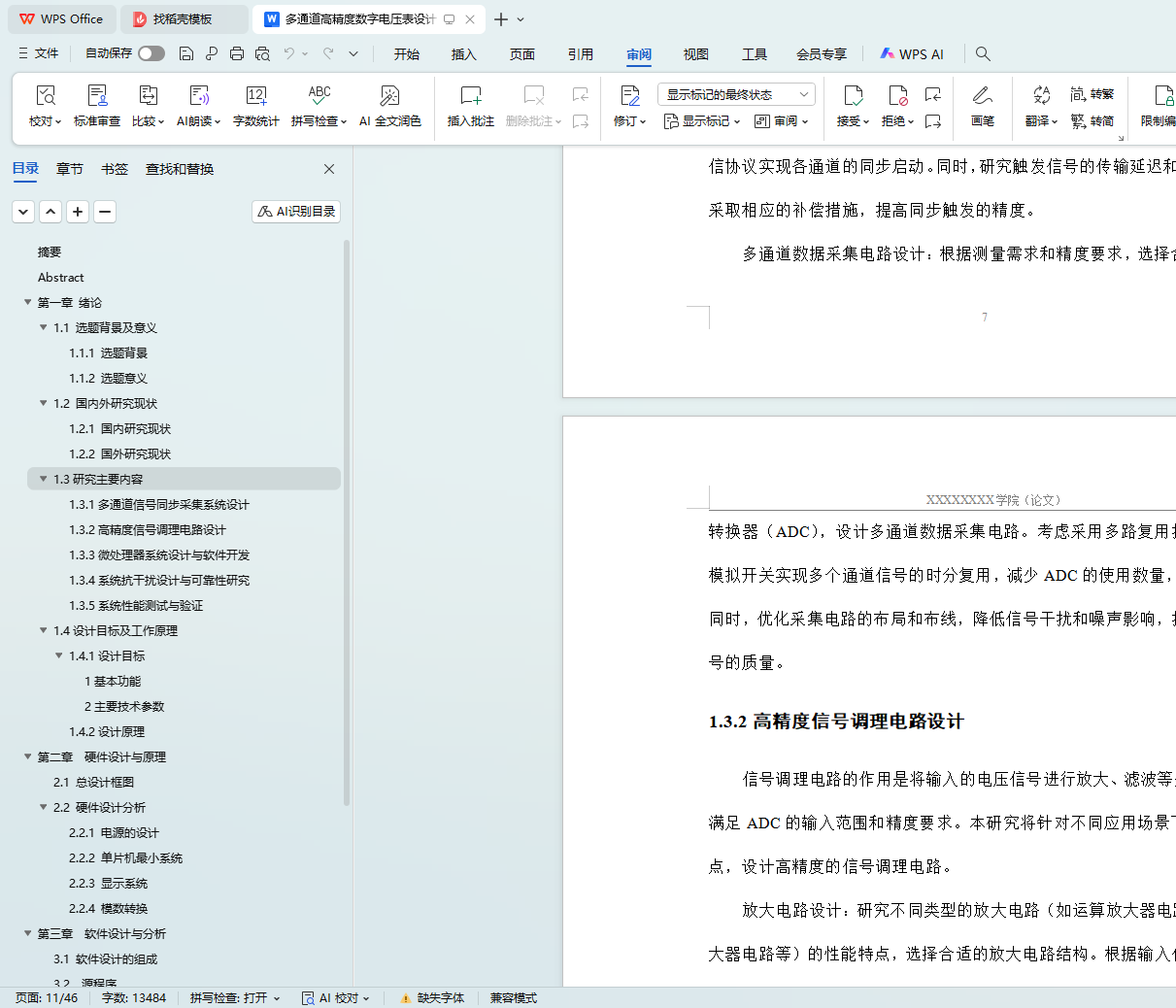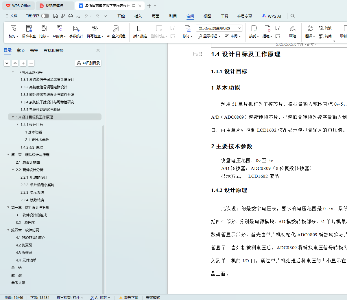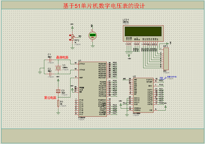 本文聚焦于多通道高精度数字电压表的设计。首先调研了国内外多通道高精度数字电压表的研究现状、核心技术及应用场景,明确设计的技术指标与创新方向。系统以 AT89C51 单片机为核心,构建总体方案,涵盖信号采集、放大滤波、A/D 转换、多通道切换以及数据处理与显示等模块。硬件设计方面,完成高精度 ADC 芯片选型,选用 ADC0809 作为模数转换芯片,精心设计信号调理电路与多通道切换逻辑电路,绘制完整的系统硬件原理图及 PCB 版图,确保电路布局合理、抗干扰性能良好,实现至少 8 路 0 - 10V 模拟电压信号采集,精度优于 0.01%。软件上,开发基于单片机的控制程序,实现多通道自动切换周期可设(10ms - 1s),数据刷新频率不低于 10Hz。该数字电压表测量电压范围为 0 - 5V,利用 ADC0809 将模拟量转换为数字量输入单片机 P0 口,再由单片机控制 LCD1602 液晶显示电压值。经测试,系统能稳定运行,满足设计要求,为多通道电压测量提供了一种可靠方案。