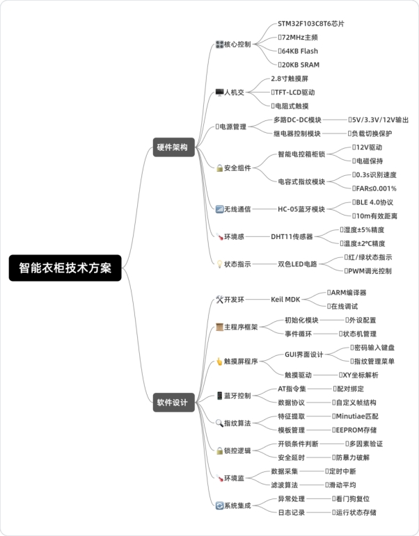 硬件方案:以 STM32F103C8T6 芯片为核心,搭配触摸显示屏实现人机交互,用户可直观查看衣柜内温湿度,进行密码输入、指纹录入删除等操作。供电模块采用多路 DC - DC 电压转换模块,为各模块稳定供电,配合 1 路继电器模块实现灵活供电控制。电子锁匙结构选用智能电控箱柜锁,保障衣柜安全。指纹识别模块采用电容式,灵敏度高、安全性强。蓝牙模块选用 HC - 05 主从机一体 BLE 蓝牙模块,方便与手机 APP 连接,实现远程控制。温湿度检测模块采用 DHT11,精准感知衣柜内环境。此外,设置指示灯显示电路,直观反映系统工作状态。