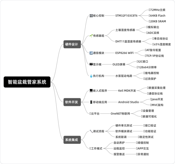 本智能盆栽管家系统围绕提升盆栽养护质量与便捷性展开,涵盖硬件与软件两大核心部分。硬件方面,以 STM32 单片机为控制中枢,搭配土壤湿度、空气温湿度传感器,实时精准采集盆栽生长环境数据。利用 WiFi 模块实现与云平台的数据交互,借助 OLED 显示屏本地展示关键参数。通过继电器控制水泵,达成智能灌溉功能。软件部分,在 STM32 上开发嵌入式程序,负责数据处理与控制指令执行;开发安卓手机 APP,方便用户远程查看数据与下发指令;搭建云平台,用于数据存储、管理与推送。完成系统搭建后,进行全面调试与测试,涵盖硬件功能、软件性能以及整体稳定性等方面,确保系统能准确、稳定运行,满足用户对盆栽智能化养护的需求。系统框架如图1所示: