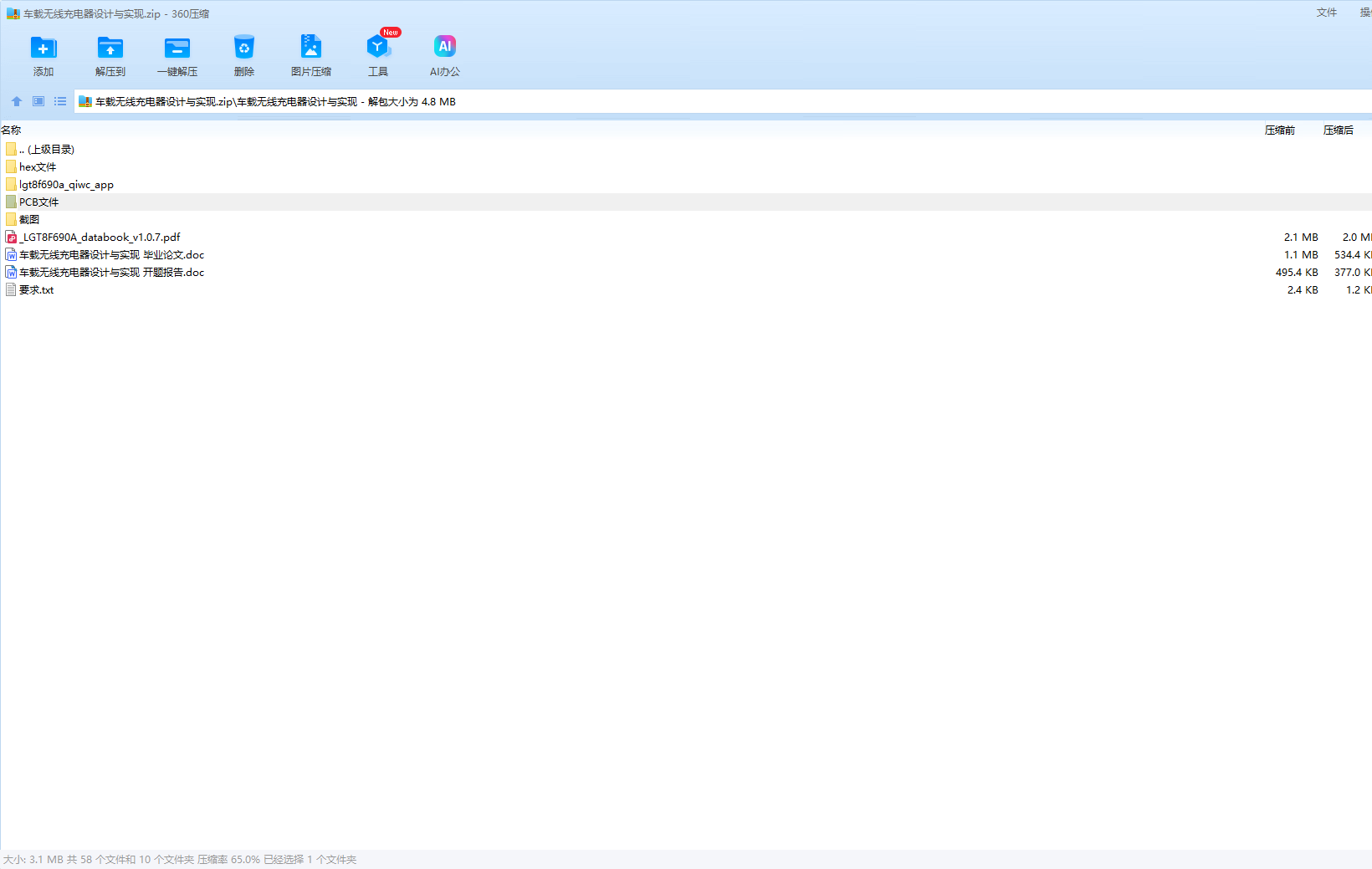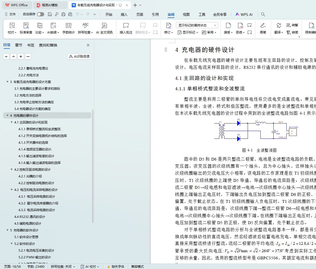 本次设计的车载无线充电器的关键是开关电源部分。用体积小、重量轻的高频变压器取代体积大的工频变压器,开关电路的拓扑结构的选择,开关器件的选择,输入输出滤波电容的选择,输出电感的选择,在本次设计中都有详细的说明。