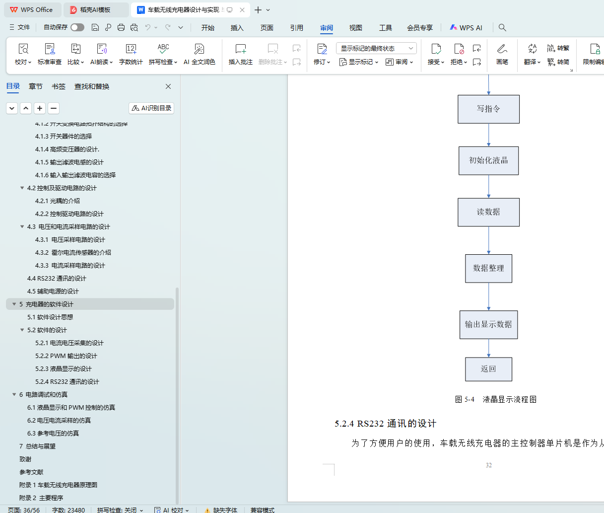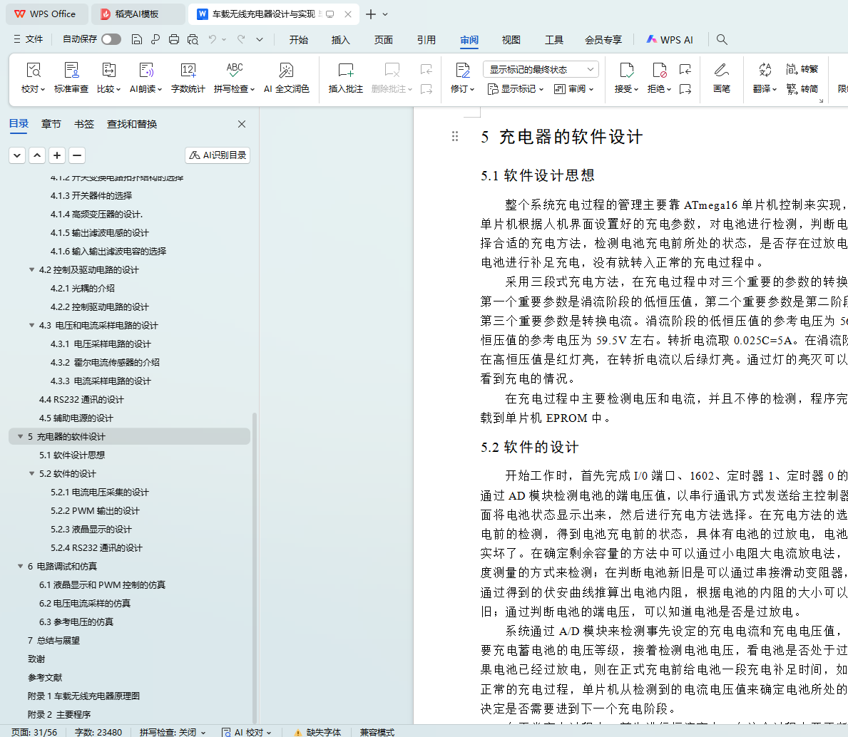 本次车载无线充电器的另一设计的关键是软件控制算法的编写。本次设计选用的是AVR单片机ATmega16,通过编程可以实现电压电流的A/D转换,电压电流和容量的显示和传输,利用PWM对恒流恒压和涓流的控制。