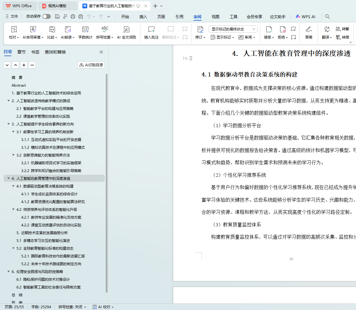 本文聚焦教育行业,对人工智能技术应用现状及趋势展开调查研究。在综合运用方面,人工智能正全方位融入教育领域。它改造传统教学模式,通过构建智能教学平台,优化课堂教学管理效率,为教学带来新活力。在提升学生综合素养上,创新叙事性学习工具培养机制,开发互动式虚拟实验平台,应用模拟仿真技术;同时探索创新思维能力智能培养方法,构建机器辅助项目式学习框架,实施跨学科知识融合智能引导。人工智能还深度渗透教育管理,构建数据驱动型教育决策系统,综合设计学生成长监测体系,研究教育资源优化配置智能算法;并推动师资培养与评估体系智能化升级,提供教师专业发展精准支持方案,开展课堂互动质量评估自动化实验。近期,多模态学习交互智能化演进,全球教育智能化标准构建动态明显,国际教育科技合作取得新进展,未来十年技术路线图制定方向逐渐明晰。然而,人工智能在教育应用中也面临伦理安全顾虑,如隐私保护问题、智能教育工具的社会责任等。针对这些问题,本文设计了相应技术对策,提出社会责任与限制方案,旨在为教育行业合理应用人工智能提供全面参考,促进教育智能化健康、可持续发展。
