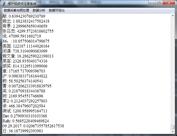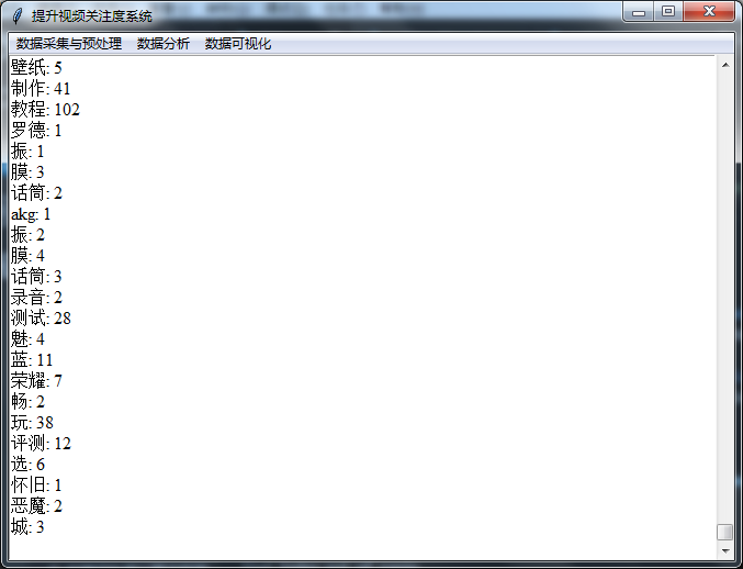 After deeply analyzing the video site's video popularity, the system collected and processed the video title and playing amount.The system includes the data acquisition, data preprocessing, data analysis, data visualization of the entire big data processing process. The data collection process collected a total of 700,000 videos for 18 days from the video website. The data preprocessing process segmented the video titles and extracted keywords from the word segmentation results. The data analysis process identified the extracted keywords. , statistics and heat calculations, clustering key words 18-day heat growth model, performing polynomial regression and evaluating regression results. The system has the characteristics of good scalability, high portability, easy maintenance, user-friendliness, and fast data collection and processing.