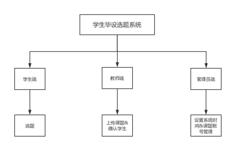 包括学生登录/登出、完善及修改个人信息、修改密码、选择至多三个课题、取消选择、查看课题详情及选题情况、查看我已选择的课题、查看最终确认的课题及课题详情、按教师名或课题名搜索题目等功能。如图2-6所示。