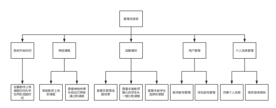 包括管理员登录/登出、修改及完善个人信息、修改密码、设定系统各阶段开放时间、查看课题详情、审核课题(审批通过/驳回)、查看课题审核结果、删除已审批的课题、查看学生选题结果、删除学生选题、查看未被教师选择的学生、查看未被学生选择的课题、一键为未被教师选择的学生分配课题、添加及删除教师/学生账号、从表格导入教师/学生账号、一键清空教师及学生账号、课题搜索、按教师或学生姓名搜索课题等。如图2-8所示。