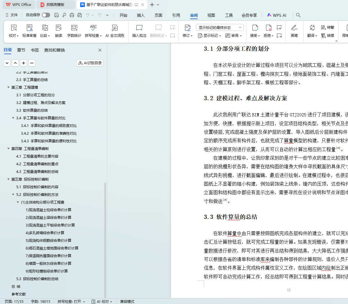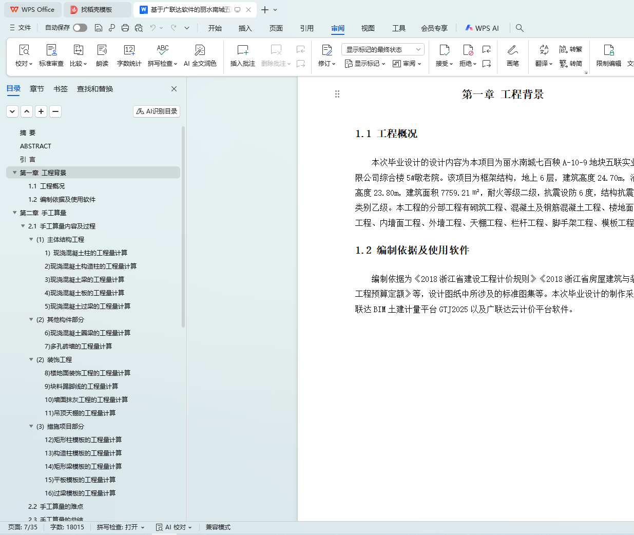 This graduation project focuses on the 5th Elderly Care Home project of Wulian Industrial Co., Ltd. in the Qibaiyang A - 10 - 9 plot of Lishui Nancheng, aiming to complete the preparation of the civil engineering quantity list and bidding control price for this project. The project is a frame - structured building with 6 floors above ground, a building height of 24.70m, a fire protection height of 23.80m, a building area of 7759.21 square meters, a fire resistance level of 2, a seismic fortification intensity of 6 degrees, and a structural seismic fortification category of B.