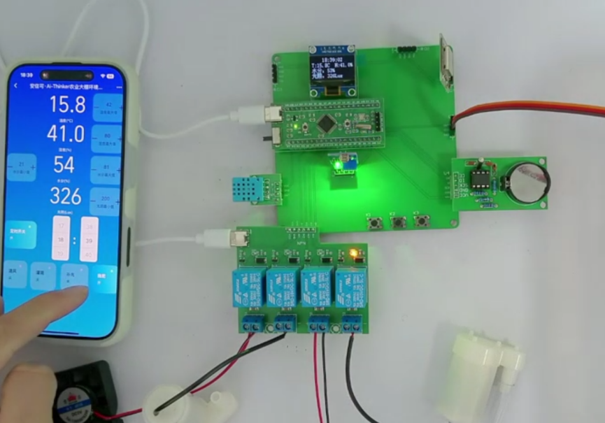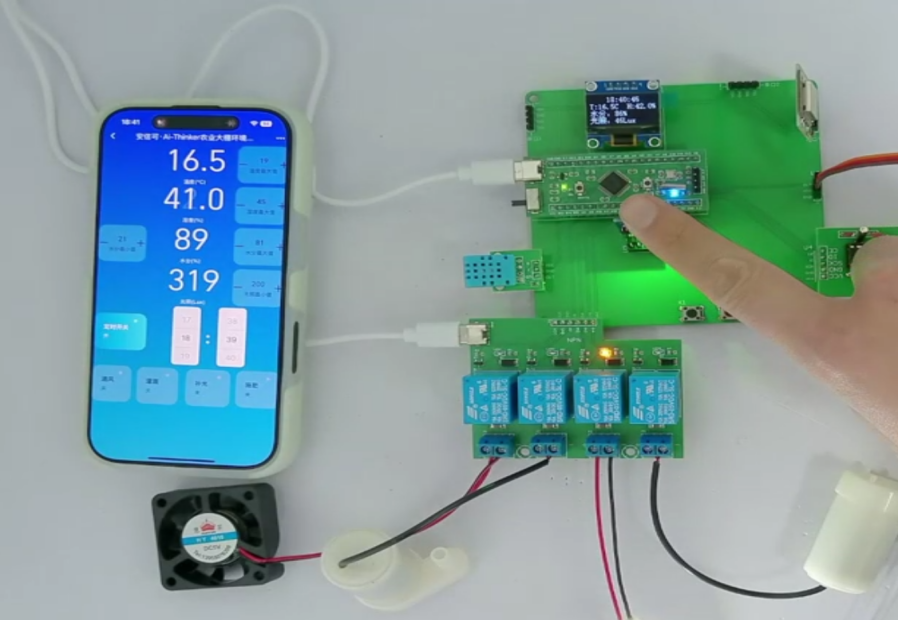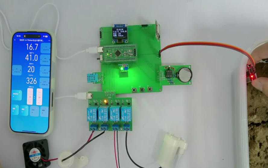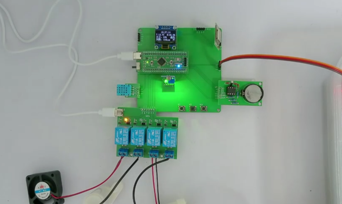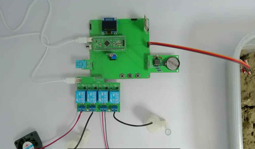 The system uses STM32F103C8T6 microcontroller as the core controller, monitors the environmental temperature and humidity through DHT11 sensor, and automatically ventilates when the detection value exceeds the set upper limit; Real time monitoring of soil moisture through soil moisture sensors. If the humidity is below the set lower limit, automatic irrigation will be carried out until the humidity meets the standard; Detecting light intensity through a light sensor and automatically replenishing light when insufficient; Equipped with a clock module to obtain the current time and set the fertilization time; Real time display of detection data using OLED display modules; Set buttons for parameter threshold setting and manual control of various components; The data is transmitted to the mobile phone through the Wi Fi module, and users can remotely set parameter thresholds and control various devices through the mobile app.