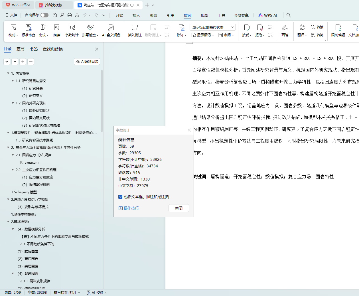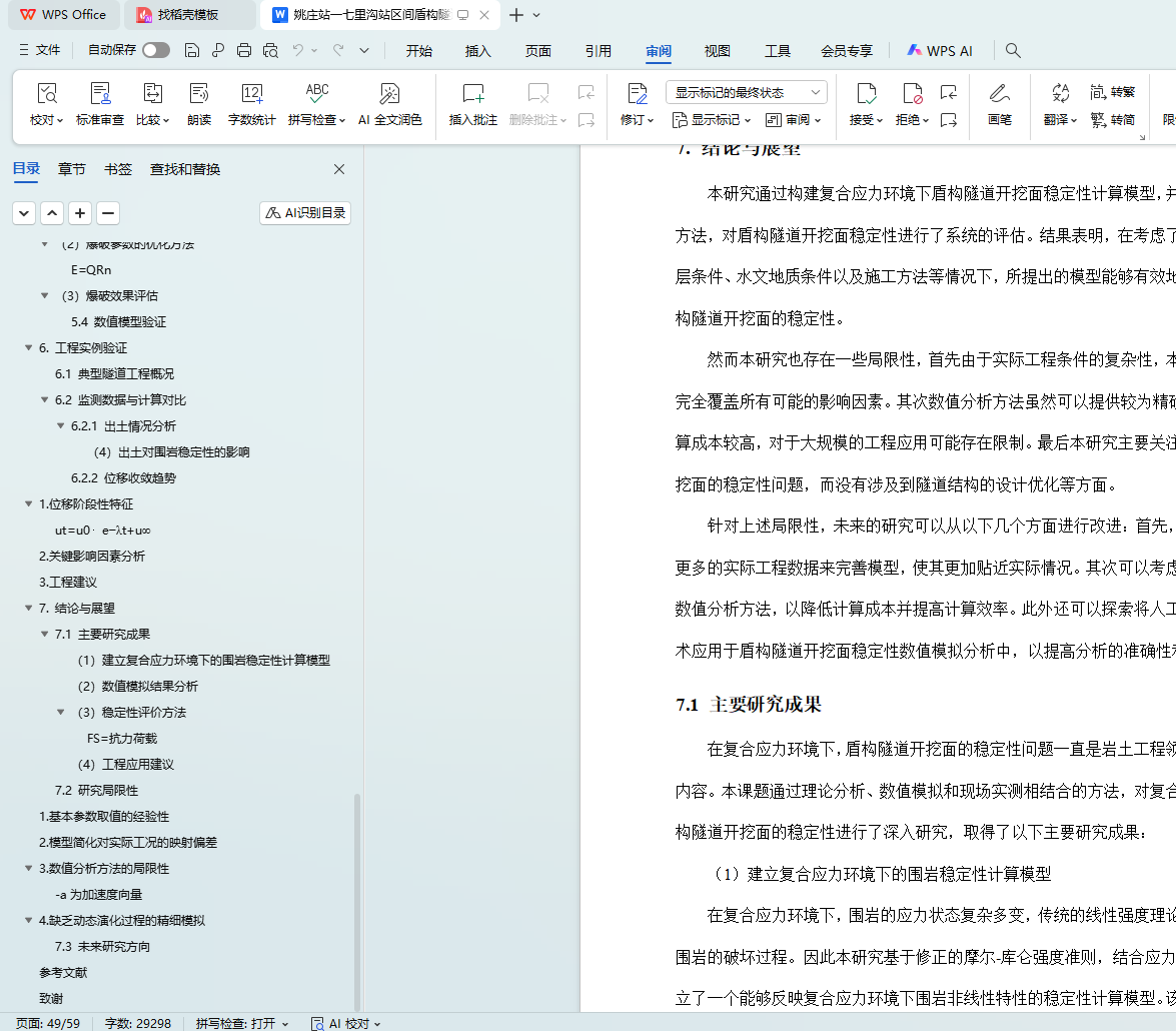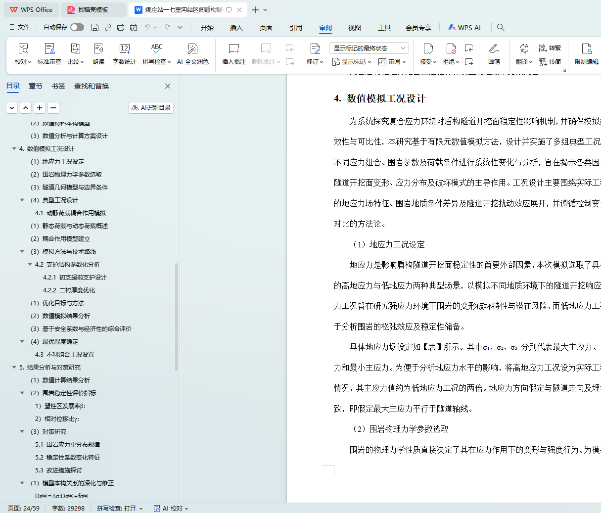 摘要:本文针对姚庄站 - 七里沟站区间盾构隧道 K2 + 300 - K2 + 800 段,开展开挖面稳定性数值模拟分析。首先阐述研究背景与意义,梳理国内外研究现状,指出现有模型局限性。接着分析复合应力场下盾构隧道开挖面力学特性,包括围岩应力分布规律、主次应力相互作用机理、不同地质条件下围岩特性等。构建盾构隧道开挖面稳定性计算方法,设计数值模拟工况,涵盖地应力工况、围岩参数、隧道几何模型与边界条件等。通过结果分析提出围岩稳定性评价指标,探讨改进措施,如模型本构关系修正、土 - 结构相互作用精细刻画等,并经工程实例验证。研究建立了复合应力环境下围岩稳定性计算模型,提出稳定性评价方法与工程应用建议,同时指出研究局限性,为未来研究指明方向。