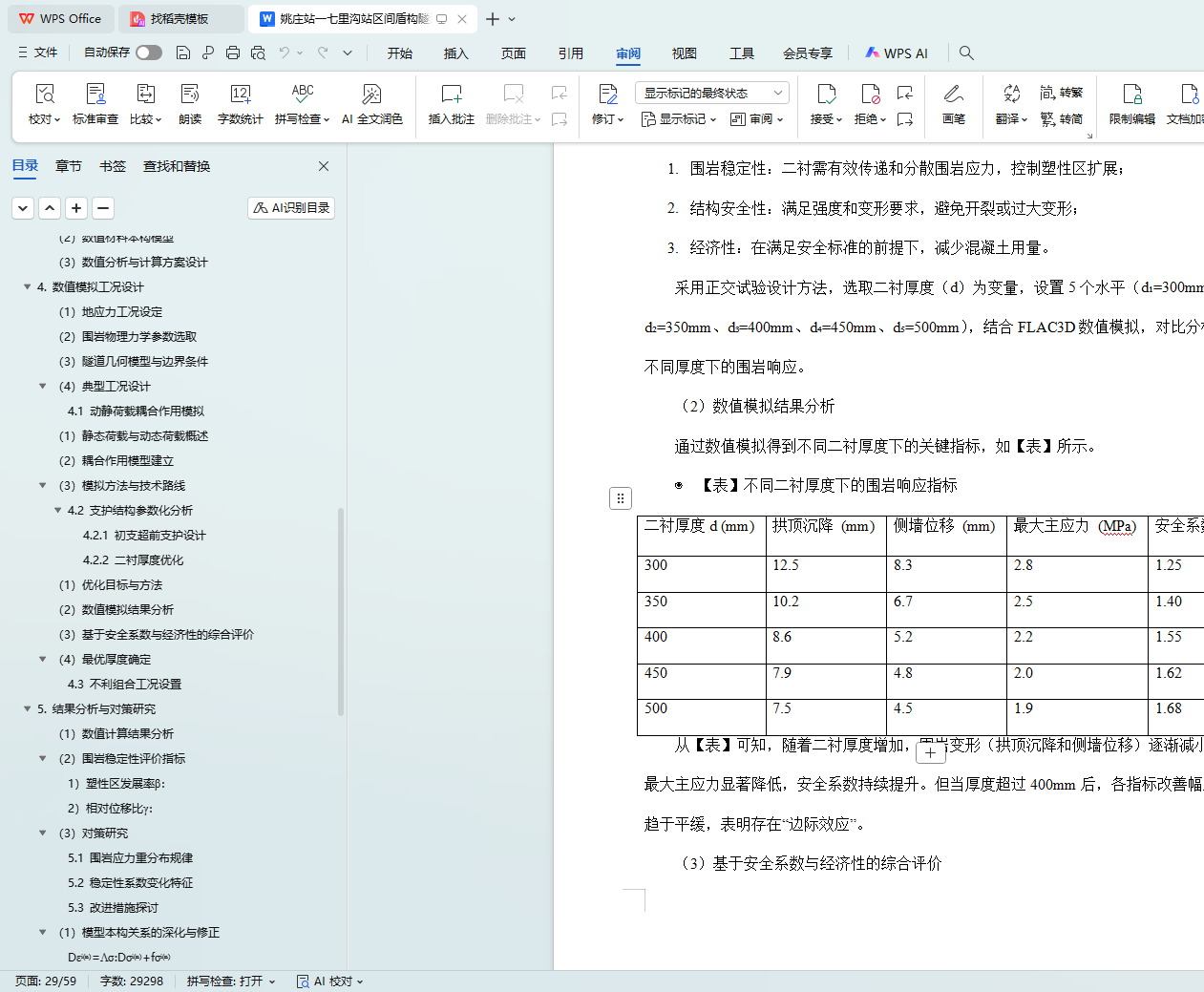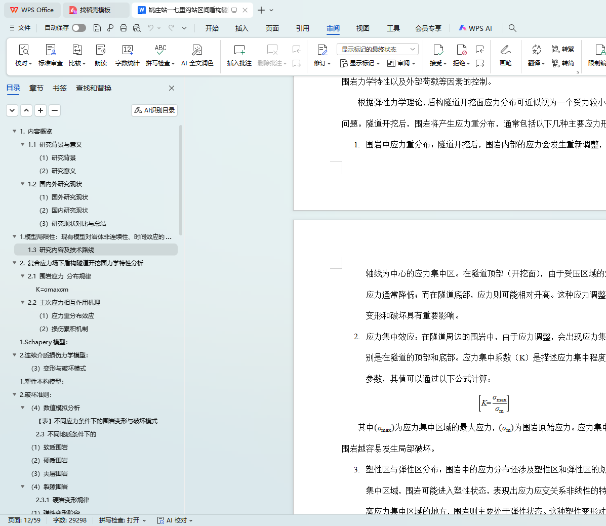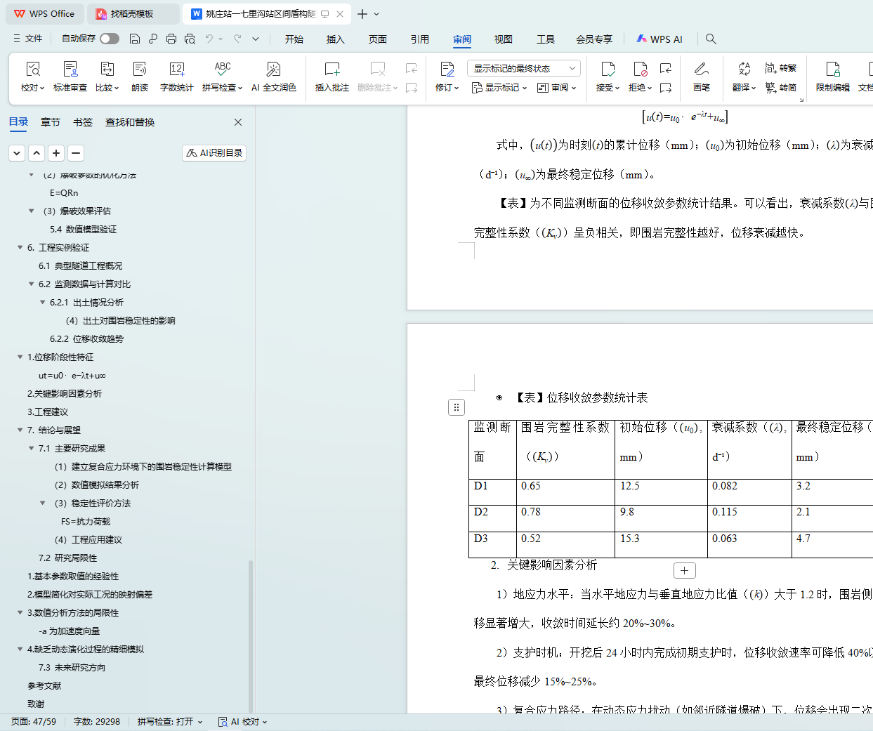摘要:本文针对姚庄站 - 七里沟站区间盾构隧道 K2 + 300 - K2 + 800 段,开展开挖面稳定性数值模拟分析。首先阐述研究背景与意义,梳理国内外研究现状,指出现有模型局限性。接着分析复合应力场下盾构隧道开挖面力学特性,包括围岩应力分布规律、主次应力相互作用机理、不同地质条件下围岩特性等。构建盾构隧道开挖面稳定性计算方法,设计数值模拟工况,涵盖地应力工况、围岩参数、隧道几何模型与边界条件等。通过结果分析提出围岩稳定性评价指标,探讨改进措施,如模型本构关系修正、土 - 结构相互作用精细刻画等,并经工程实例验证。研究建立了复合应力环境下围岩稳定性计算模型,提出稳定性评价方法与工程应用建议,同时指出研究局限性,为未来研究指明方向。