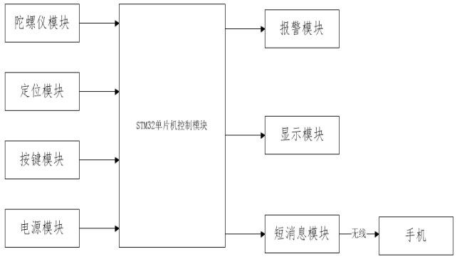高龄老人智能看护终端设计系统主要由八个模块构成,分别是STM32单片机控制模块、陀螺仪模块、定位模块、按键模块、电源模块、报警模块、显示模块、短消息模块构成。系统总体设计框图如图1所示。