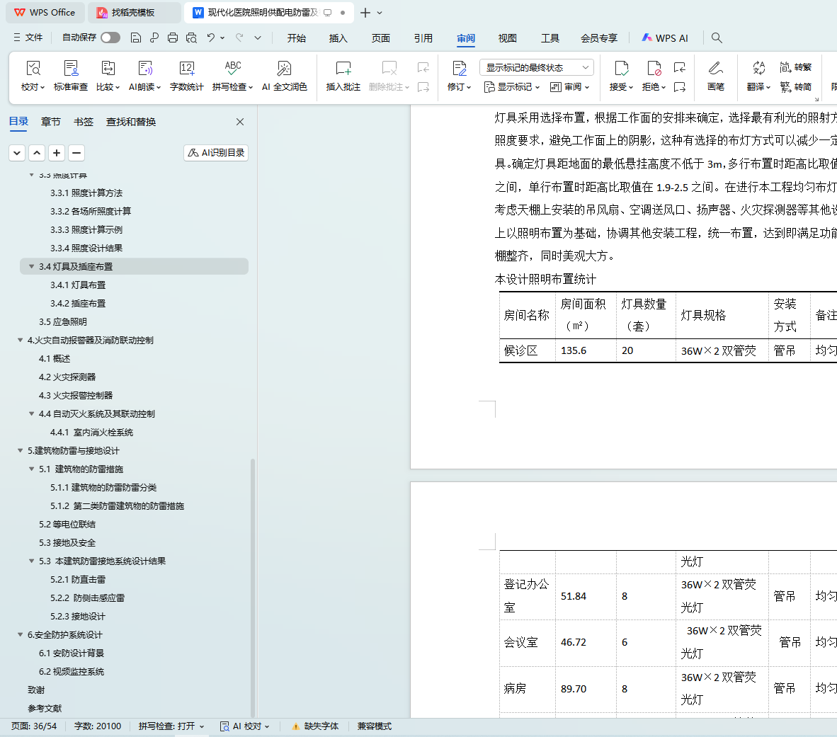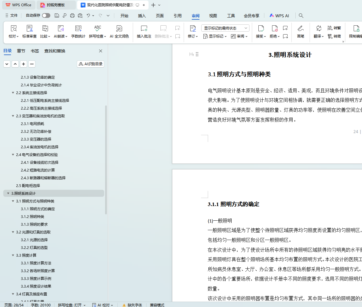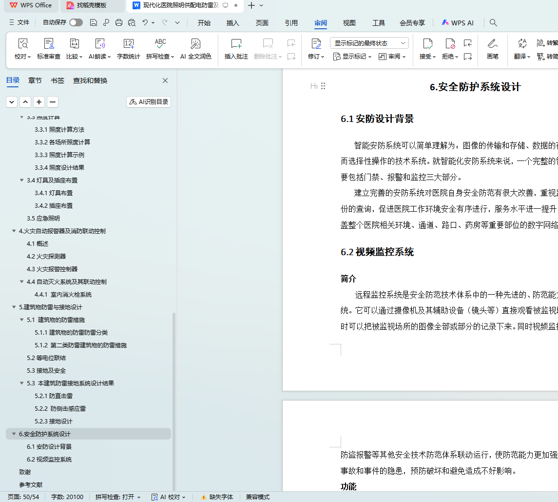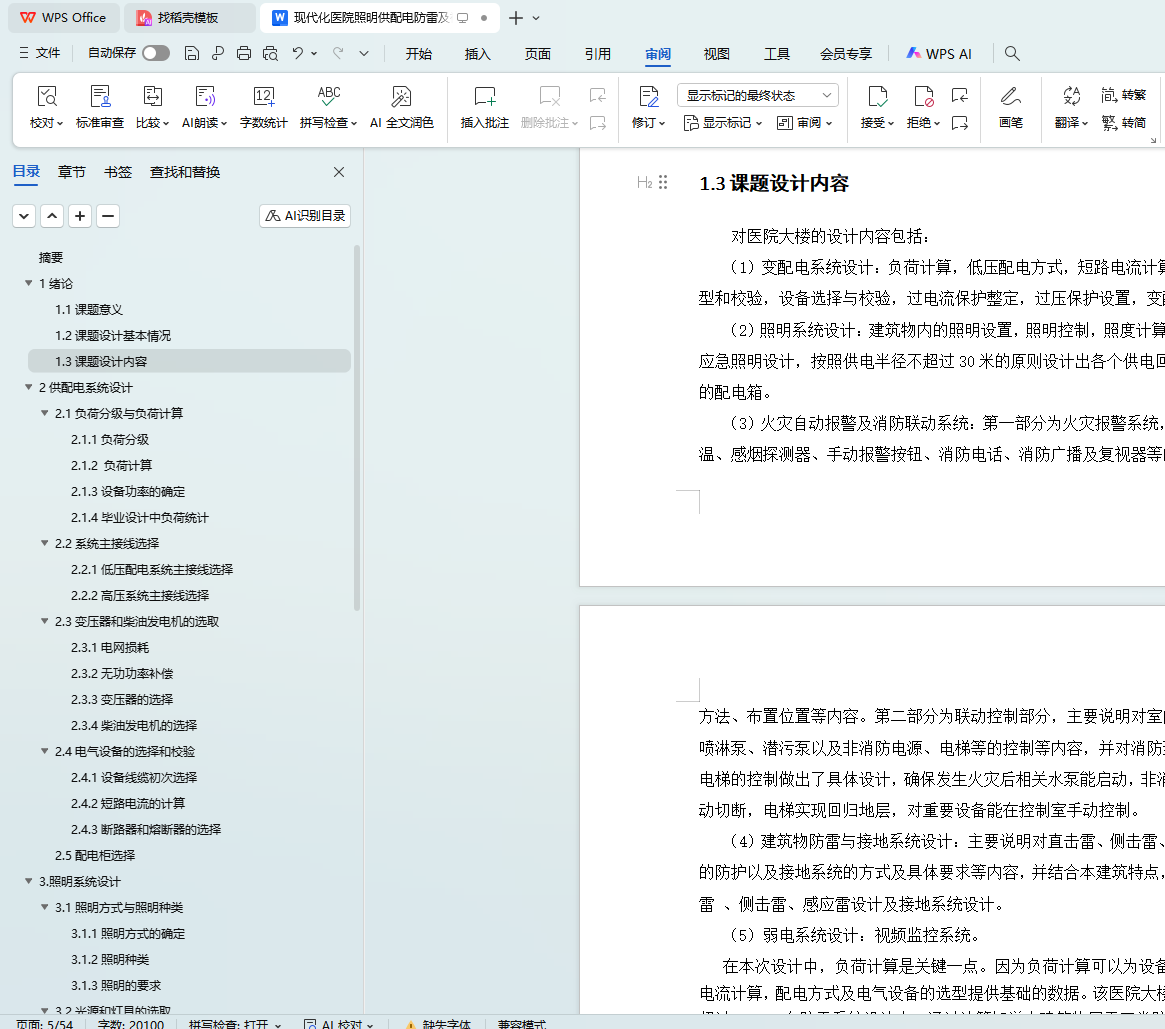 本论文将会在第二章的供配电设计中,根据规范要求,确定各方面的负荷等级,及配电需求。从设备选择,电压损失,电缆选型和电气设备选型和校验等方面介绍本次医疗大楼的配电设计。第三章的照明系统将会从照度计算,灯具选型及插座布置等几个方面进行讲解。第四章的火灾自动报警及消防联动控制系统将从防火等级的划分,探测器的选型和布置,消防联动控制等几个方面加以说明。第五章的防雷与接地设计将从防雷建筑的划分,接地要求和材料选型等方面加以说明。第六章的安防系统简要介绍视频监控。除此还会标出施工注意事项,让所做出的系统符合各个方面的要求。对于安装,以及布线的论述将会综合照明与配电统一介绍。