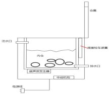 图 2.3 超声波清洗机简图 结合设计需求条件,本次设计的家用果蔬清洗机,将采用涡轮式清洗原理,涡轮式清洗机不仅结 构简单,而且其清洗过程中果蔬均浸泡或半浸泡在水里进行清理,能有效避免在清洗过程中造成的碰 撞伤害,水流的冲洗使果蔬上的污渍松动,涡轮的旋转产生离心力将污渍带走,达到清洗的效果。还 可以根据清洗的物料不同改变清洗液的化学性质达到去除农药残留等,全机械的设计结构导致他制作 成本低较低,技术较为成熟,可更好的控制价格,更易被广大人民接受。 2.2.2 机械系统的设计本次设计的果蔬清洗机是以涡轮式为清洗方式的机器。使用时,需外接 220V 家用电源,设有进水口和排水口,可以接入水龙头或净水器等设备,由机器控制内仓中的水量,也可人为倒入清洗液浸 泡消毒后再进行清洗,电机在内仓左侧,清洗时,电机启动带动内仓旋转,同时上方的喷射口开始向 下喷射强劲水流,液面检测机构保证整个清洗过程中水的循环,避免内仓的水量过多溢出机器或者水