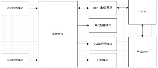 本次设计软件方面主要分成WIFI通信控制模块、人体感应报警模块、火警报警模块、OLED屏显示模块、门锁模块。