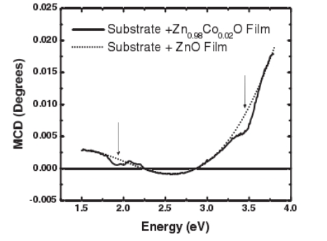 grown on a similar sub- strate. Both sets of data were taken at 10 K in a field of 0.45 T. The arrows indicate the d-d transitions at 2 eV and the feature at the ZnO band edge at 3.4 eV for the