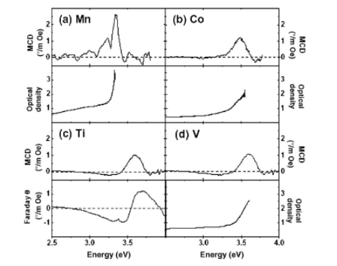 Figure 2 shows the room temperature MCD spectra of ZnO doped with Co (2%),Mn(2%),Ti(2%),and V(5%) together with the absorption spectra for the Mn-, Co-, and V-doped samples, and the Faraday spectrum for the Ti- doped film. The absorption spectrum of the Ti: ZnO was similar to that of V: ZnO .The absorption spectra all show an edge at the band gap, although the Mn spectrum is much steeper than the other three. We shall argue below that this is related to the fact that only the Mn-doped sample showed semi- conducting rather than metallic conductivity at 300 K The sign of the MCD signal at the band edge was the same for all dopants as consistent with an electron mechanism in all cases[11].