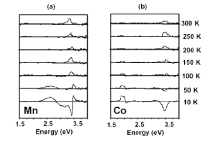 The origin of the MCD may be explored in more detail by studying its temperature dependence. Figure 4 presents MCD data for the Mn-and Co-doped samples from 10 K to room temperature. Both samples show a negative excitonic feature at low temperatures that has been observed previously[13].This signal weakens rapidly as the temperature increases, both because of its paramagnetic nature and because the number of carriers increases, leading to exciton screening. The band edge signal at temperatures above 150 K is dominated by the positive feature shown in Fig.2.The fact that the MCD does not show a dependence on 1/T above 100 K is a further indication that it arises from the ferromagnetic component.