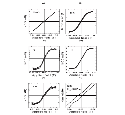 The ferromagnetic origin of the band edge MCD is confirmed by the ob- servation of open MCD hysteresis loops for the Co-,V-,and Ti-doped films and a Kerr rotation hysteresis loop for Mn. Figure 3 shows the open loops obtained for the doped samples compared to the closed loop for the control pure ZnO film. These results constitute the first observation of open M-O loops for the ZnO band edge transition at room temperature. Previous hysteresis loops were either taken at low temperature[13,14]or showed no resonant signal at the band edge[15]. Coercive fields of