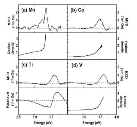图2显示了室温Co(2%)、Mn(2%)、Ti(2%)和V(5%)掺杂ZnO的MCD光谱,和Mn-,Co- 和 V- 掺杂样品的吸收光谱,以及Ti- 掺杂薄膜的法拉第光谱。Ti 掺杂ZnO 和V 掺杂ZnO 的吸收光谱相似。吸收频谱都显示了带间隙的能量,尽管Mn的光谱相比于其它三个很陡峭。我们将在下面讨论这和Mn掺杂ZnO样品显示的半导体性的事实相关,而非在300K的金属导电率。