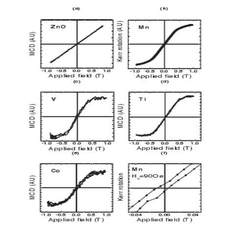 Co-,V-和Ti-掺杂薄膜开着的MCD迟滞环的发现,以及Mn的克尔旋转迟滞环使得能带边缘MCD的铁磁性起源得到了确认。图3显示了掺杂样品的开环,纯ZnO的闭环的获得。这些结果形成了室温下ZnO能带转变M-O开环的第一观察。早先的磁滞现象环或在低温下获得,或表明在能带边缘没有共振信号。在90、150、100和180 40CGS下的强磁场被依次用来测量Mn-,Co-,Ti-和 V-的掺杂样品,其值和那些在100CGS下被超导量子干涉仪磁强测量的结果保持一致。