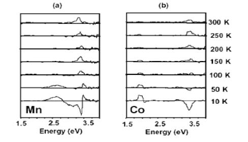 Mn掺杂ZnO的光谱还显示了在2.5eV另一个特性,他在50K时削弱,同时在100K消失。这似乎符合要么是少数相位的Mn3O4,它有一个43K的居里温度,要么是Mn2O3,它在83K有一个转变。在较高能量下,在2.55和3.2eV之间有一些很微弱的Mn d-d交换。在较低温度下,Co掺杂材料仍显示了在2eV下的另一个特性,Co二价离子从晶体场劈裂。