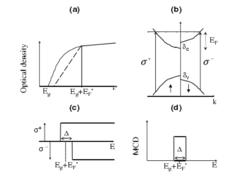 图5.(a)重掺杂n型半导体的非磁光密度示意图。虚线:未掺杂半导体;点化线:费米能级以上由于价带到导带过渡的吸收曲线;实线: