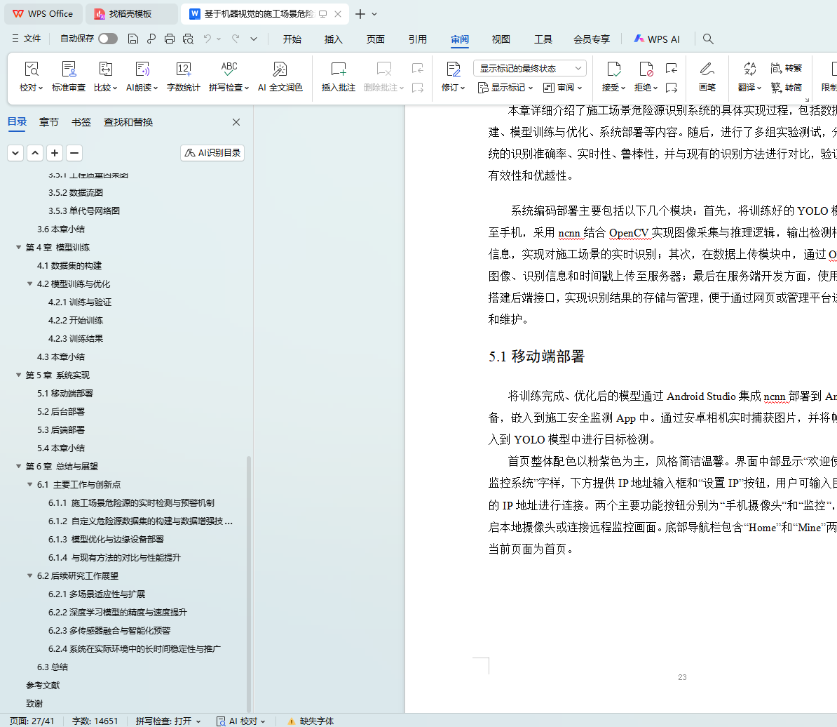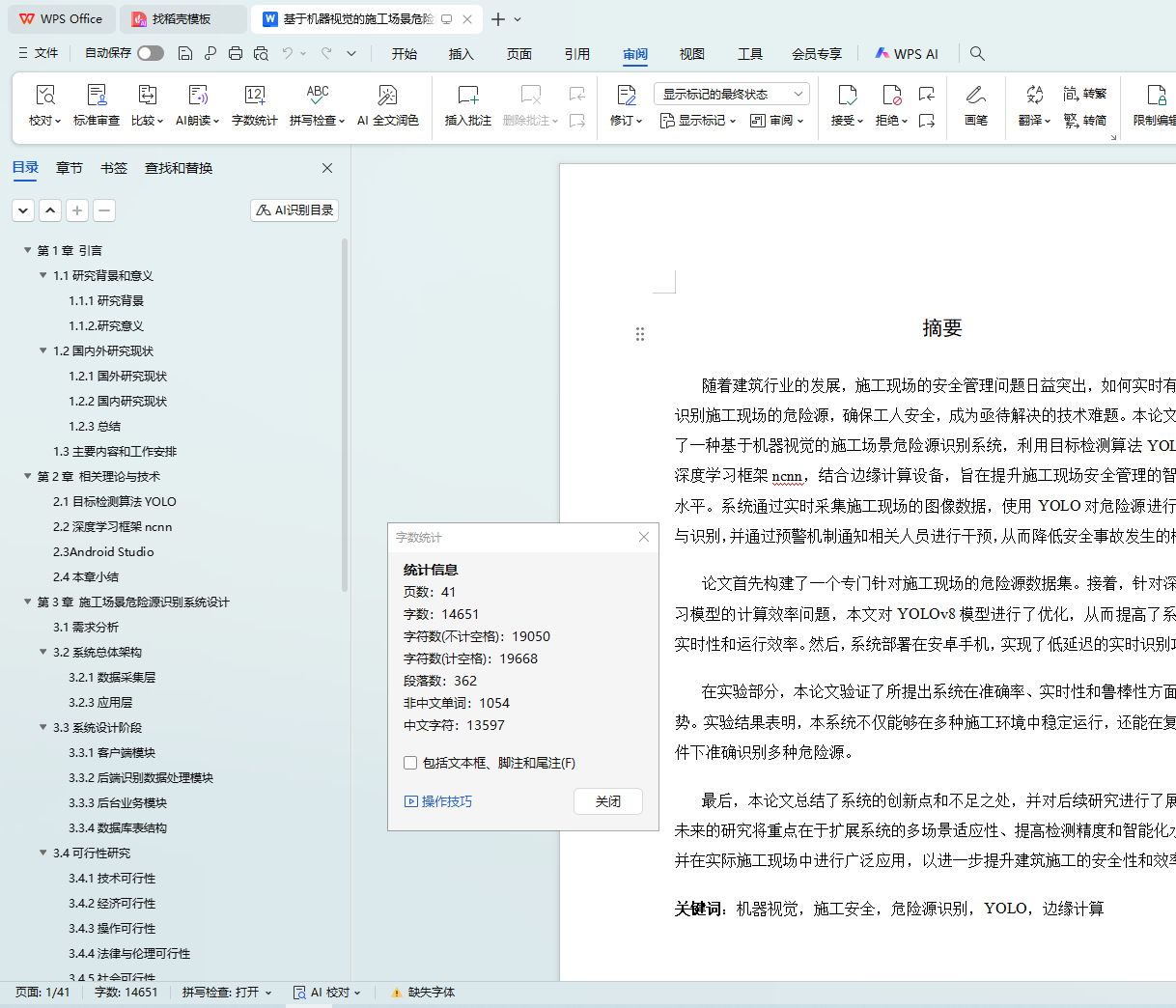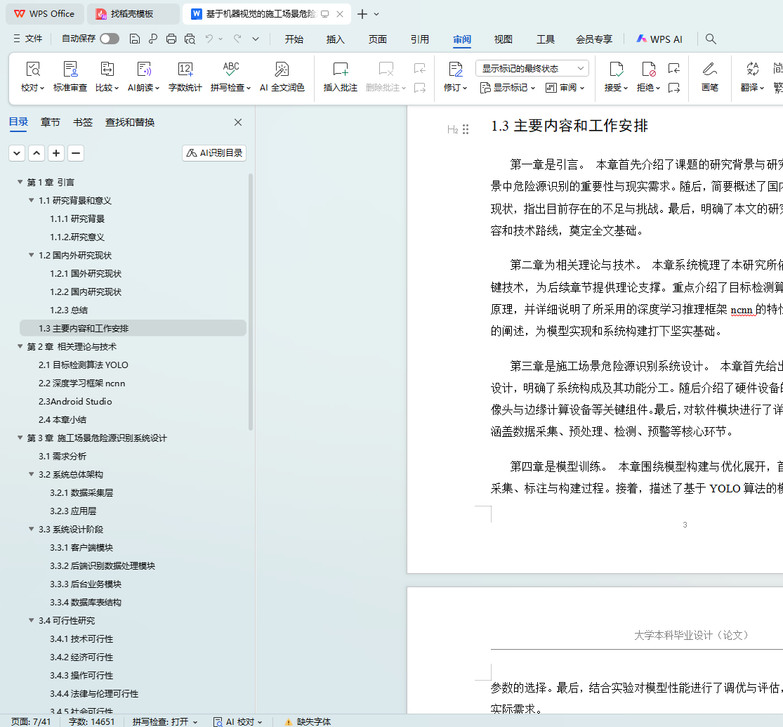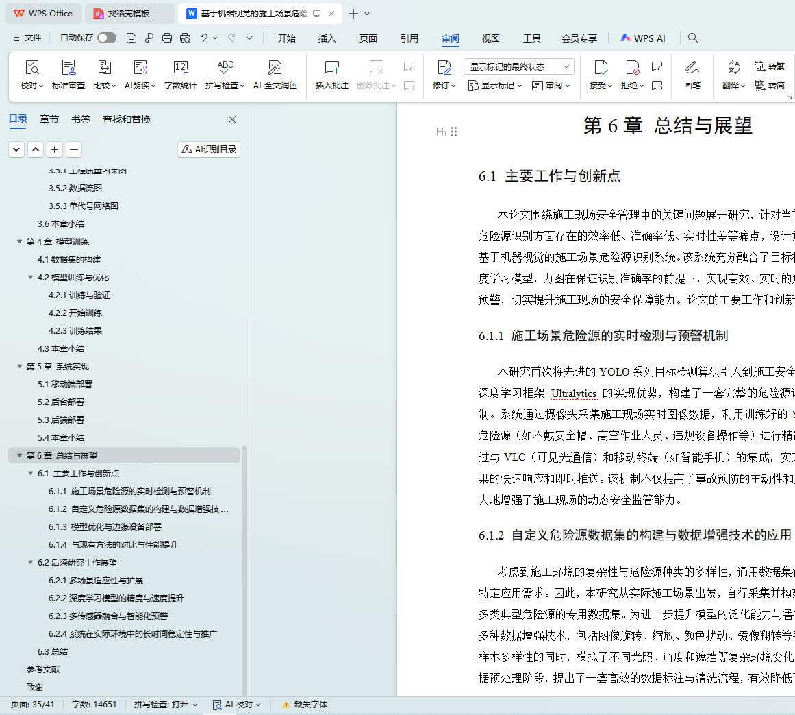 最后,本论文总结了系统的创新点和不足之处,并对后续研究进行了展望。未来的研究将重点在于扩展系统的多场景适应性、提高检测精度和智能化水平,并在实际施工现场中进行广泛应用,以进一步提升建筑施工的安全性和效率。