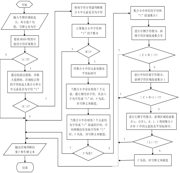 参考自然场景下的文本检测 方法和车牌中的字符分布特 点,对车牌候选区域提取改 进的最大稳定极值区域,通 过使用非极大值抑制和区域 校正得到字符候选人,通过 字符判断分类器和字符搜索, 实现非车牌区域的滤除和车 牌区域7个字符的提取,其
