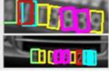 图b中黄色矩形框为图a中区域经字符判断后为字符的对象,被称为“字符种子”,浅绿色矩形框为为非字符对象,粉红色矩形框为在“字符种子”之间被搜素为字符的对象,蓝色矩形框为在最左和最右侧“字符种子”两侧进行“滑窗搜索”但检测结果不是字符的对象,红色是判断为字符的对象;