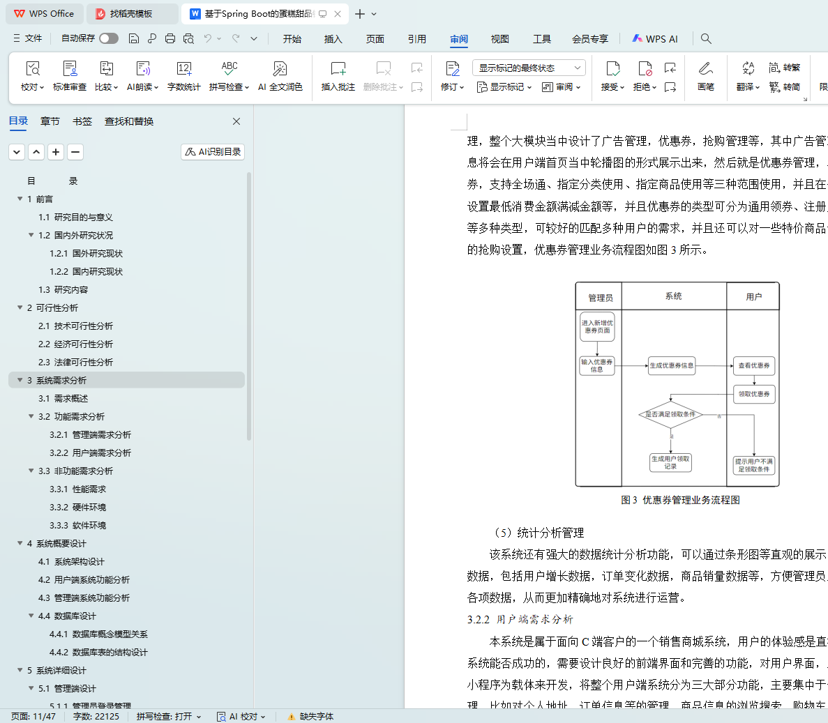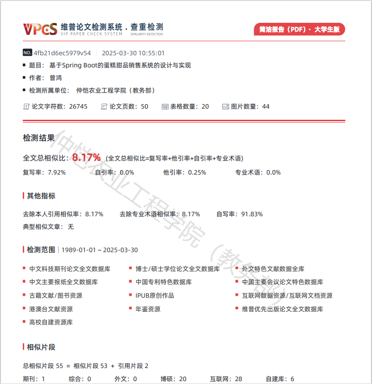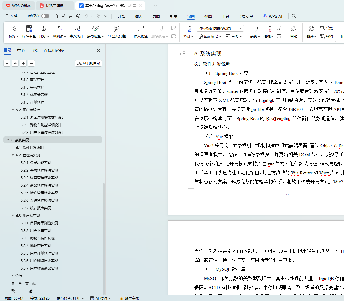 With the growth of the country's economy and the improvement of the quality of life, people's demand for cakes and desserts has gone beyond the material level and reflects more spiritual pursuits. However, traditional shopping requires customers to pick and purchase in person, which is time-consuming and difficult to meet personalized needs. Merchants face fierce competition in the market and inefficient manual order processing, which limits the quality and competitiveness of their services. To this end, this project has developed a cake dessert sales system based on the Spring Boot framework, which is built with the Vue framework at the front end and relies on Spring Boot at the back end to ensure the stability and scalability of the system. The user interface is realized through the WeChat applet, and the database uses MySQL for data storage, which is a very safe and efficient storage method, which can store a large amount of user data, and the management background includes functions such as member management, order management, evaluation management and commodity management to help merchants optimize business processes. User-side users can browse goods, collect goods, receive coupons, and place orders for goods, so that they can buy cakes and desserts online without leaving home, providing a convenient and personalized shopping experience.