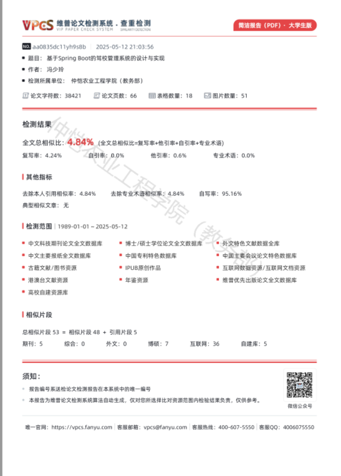 随着经济的快速发展和驾照需求的增加,传统驾校管理系统面临着信息化水平低、人工操作失误及效率低下等问题,本研究提出并开发了一套基于Spring Boot后端框架与Vue.js前端框架的驾校综合管理系统。可提高管理效率,优化资源配置,并加强对驾校各项事务的管理。本项目致力于开发一个驾校管理系统,该系统采用前后端分离的架构设计,主要涵盖学员管理、教练管理、教练排班、课程预约、考试成绩、考试安排和财报统计等功能模块,并通过角色权限控制实现安全管理。重点解决了教练排班中场地与车辆的排程冲突问题。本论文全面阐述系统的需求分析过程、架构设计思路以及关键功能模块。系统设计时充分考虑了扩展性与安全性,旨在为后续的功能拓展奠定一个稳固的基础。总体而言,所提出的系统有效推动了驾校行业的信息化建设,提升了管理效率与用户满意度。