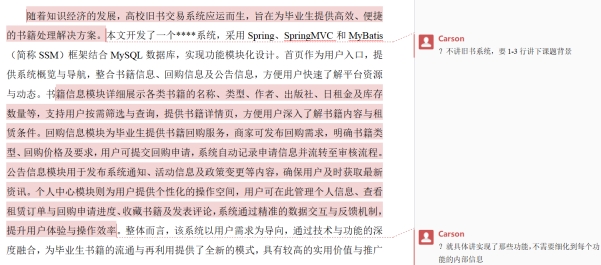 摘要要1-3行讲下课题背景,具体讲实现了那些功能,不需要细化到每个功能的内部信息;国内外研究现状篇幅上差3-4行才满1页半;系统用户用例图的角色名称有误;需求分析要需要业务流程图,用户角色之间的交互;系统e-r图要用ERstudio绘制。